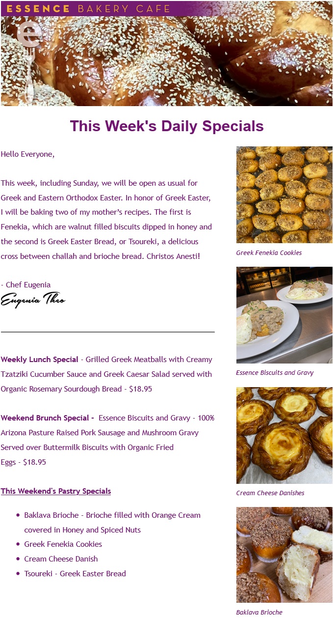 Daily Specials starting 4/8/26 By nathan | April 7, 2026 | Comments Off on Daily Specials starting 4/8/26 View on Mailchimp @essencebakery on Instagram, Facebook Posted in weekly menu and tagged Specials